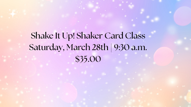 Shake It Up! Shaker Card Class Saturday, March 28th | 9:30 a.m.$35.00 Ready to add a little movement (and a lot of fun) to your cardmaking? In this...